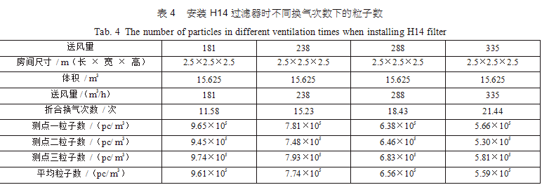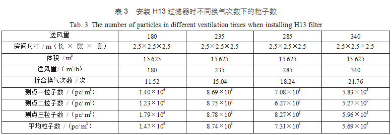 在空調(diào)機(jī)房中新建了三間2.5m×2.5m×2.5m的潔凈間,從空調(diào)主風(fēng)管引風(fēng),每支支管設(shè)置調(diào)節(jié) 閥,并設(shè)排風(fēng)機(jī)進(jìn)行全排,送回風(fēng)口及測(cè)點(diǎn)布置分別如圖 3(每點(diǎn)取樣三次,取平均值)??紤]到初中效過(guò)濾器對(duì)最后潔凈度的影響和最后理論塵埃數(shù)量 計(jì)算的方便,試驗(yàn)用初中效繼續(xù)分別為G4、F8,三個(gè)房間分別安裝高效過(guò)濾器,風(fēng)量500m3/h,第一組數(shù)據(jù)為送風(fēng)量按GMP 驗(yàn)證指南推薦換氣次數(shù)保持不變,分別用H12、H13、H14、U15過(guò)濾器,第二組數(shù)據(jù)為采用H13高效過(guò)濾器,調(diào)節(jié)風(fēng)量 ;第三組數(shù)據(jù)為采用H14高效過(guò)濾器,調(diào)節(jié)風(fēng)量,分別測(cè)得塵埃粒子數(shù),并列表得出不同的換氣次數(shù)下對(duì)應(yīng)的塵埃數(shù)如表2、表3、表4。